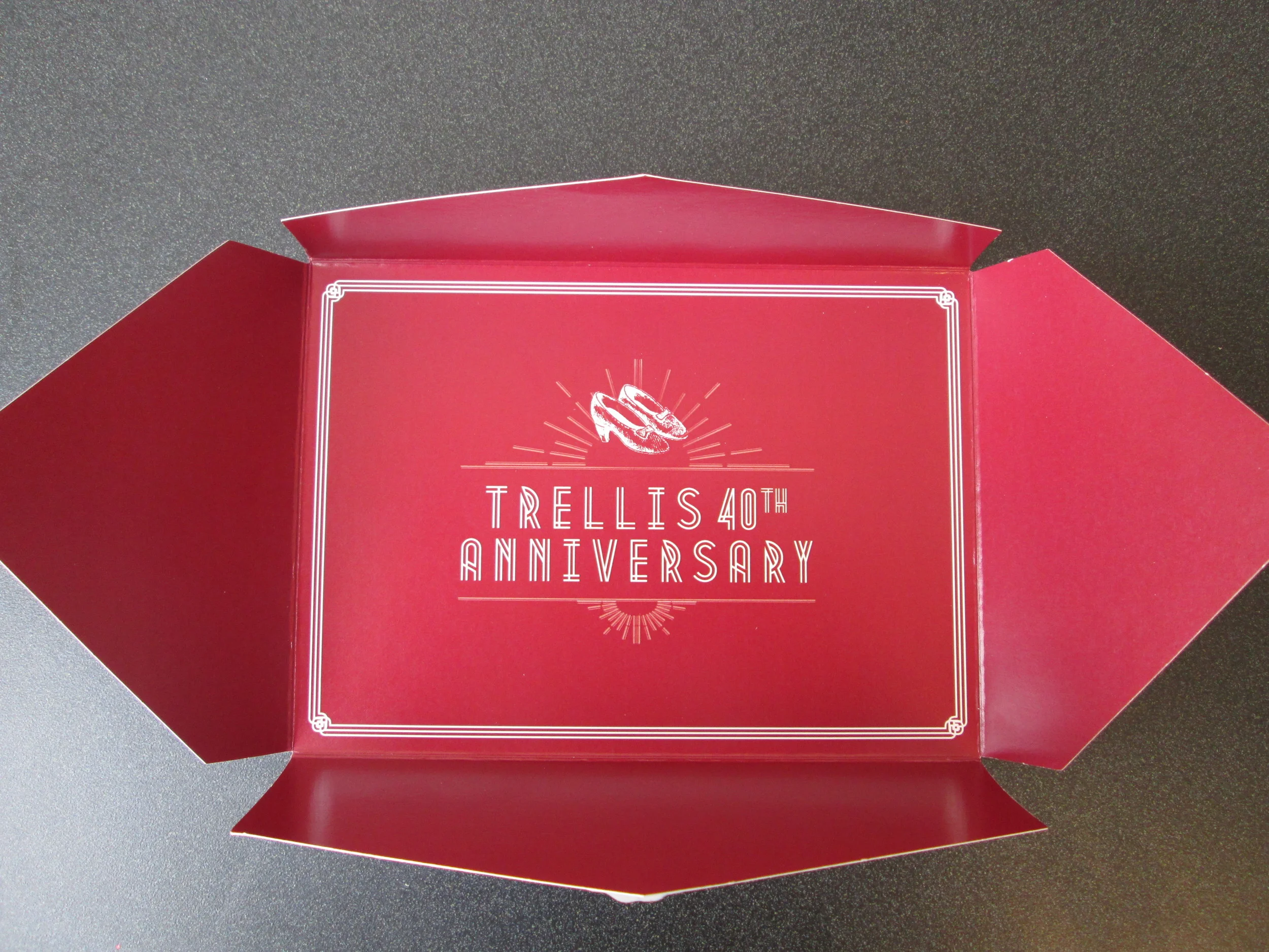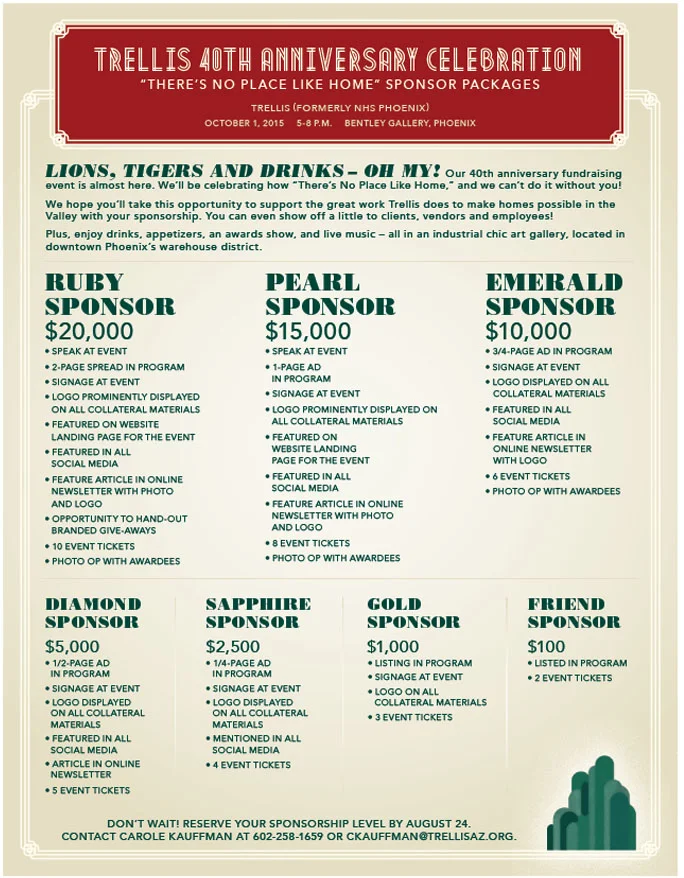 We themed the fundraiser "There's No Place Like Home." How'd we get there? Well, the number 40 is represented by a ruby. Ruby led us to ruby slippers. Which led us to Wizard of Oz. And that turned into the famous line "There's No Place Like Home." And Trellis is all about home ownership!